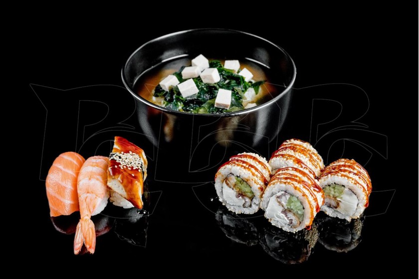 Мисо супчик, Сушки:с лососем 1 шт, креветка 1шт, угорь 1шт. Ролл Нежный угорь половинка (4 кусочка)